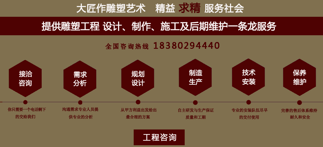 成都大匠作雕塑有限公司,是經(jīng)成都工商局審定注冊的正規(guī)專業(yè)雕塑制作及工程安裝服務(wù)機(jī)構(gòu),是由一群年輕富有朝氣的年輕人創(chuàng)辦,發(fā)軔于四川省成都市龍泉驛區(qū)。它是一家******于創(chuàng)作、制作和銷售為一體的公司。大匠作擁有多年從事公共藝術(shù)的專業(yè)人員和雕塑制作人組成的核心團(tuán)隊,為您提供專業(yè)、具創(chuàng)新的設(shè)計及制作服務(wù)。公司成立以來,秉承“******服務(wù)、誠信為本”的宗旨,以客戶需求為目標(biāo)導(dǎo)向,不斷學(xué)習(xí),進(jìn)取,優(yōu)化和提高服務(wù)質(zhì)量,公司向您******——“您的滿意***是我們的信譽”,我們將以飽滿的熱情和******的服務(wù)贏得您的贊譽和支持。